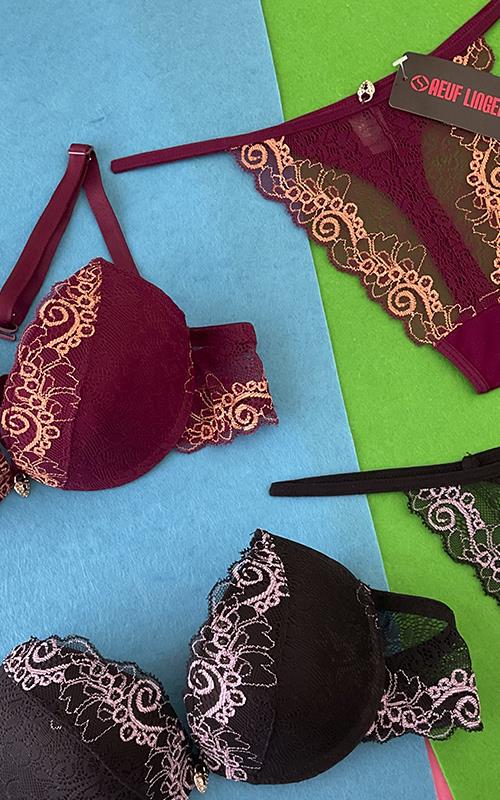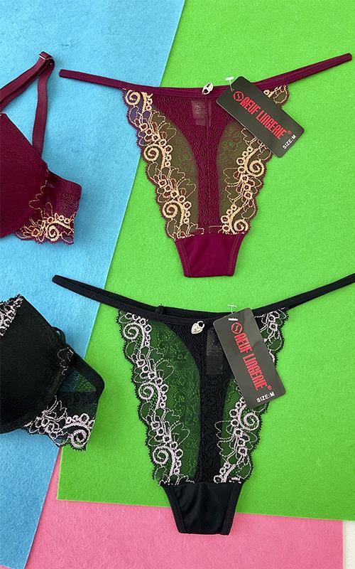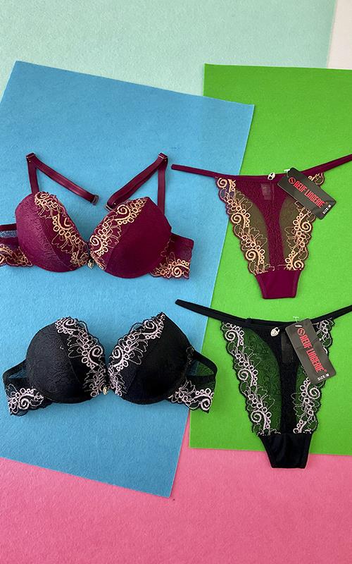 Conjunto de sujetador con push up. Con tirantes desmontables. Y con braga tanga de encaje a juego.