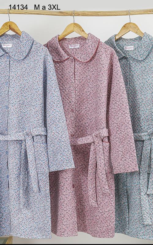 Bata afelpada para señora. Bata abotonada, con bolsillos y con cinturón.